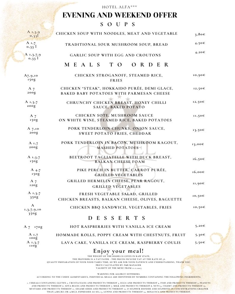 The restaurant at Hotel Alfa in Giraltovce is known for its pleasant atmosphere and excellent cuisine. It offers a wide selection of traditional Slovak dishes as well as international specialties prepared from fresh ingredients. The interior of the restaurant is modern and tastefully furnished, which contributes to a comfortable and cozy environment. The staff is friendly and professional, always ready to fulfill guests' wishes. In addition to the daily menu, the restaurant also offers special events and themed evenings. It is an ideal place for celebrations, family gatherings or romantic dinners.